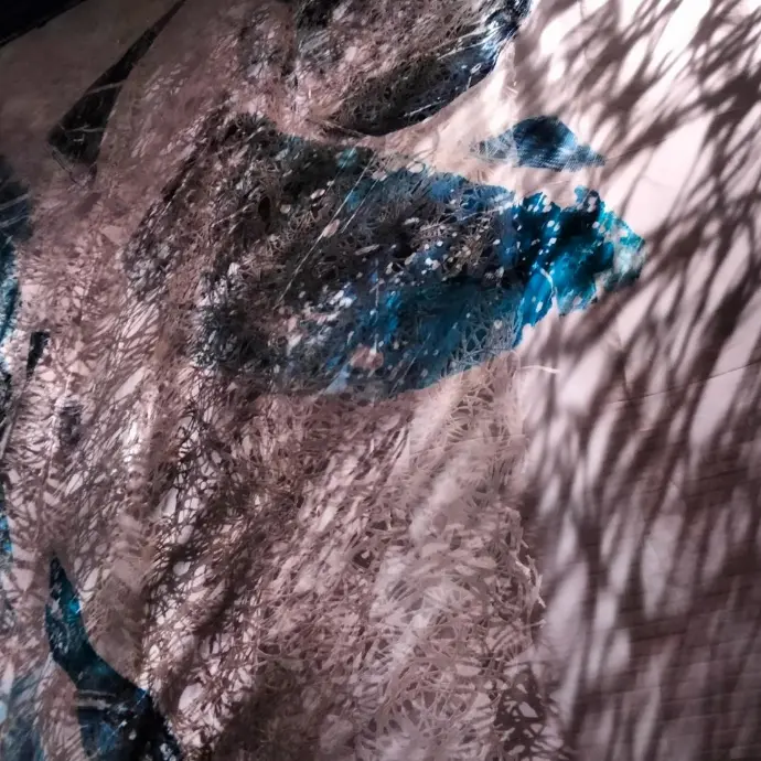 J’ai alors commencé à travailler de façon artisanale, avec une trame de fond, tel un filet apparaissant d’abord par un jeu d’ombres et de lumière, évoquant une inextricabilité des liens familiaux à la fois protecteurs et enfermants.