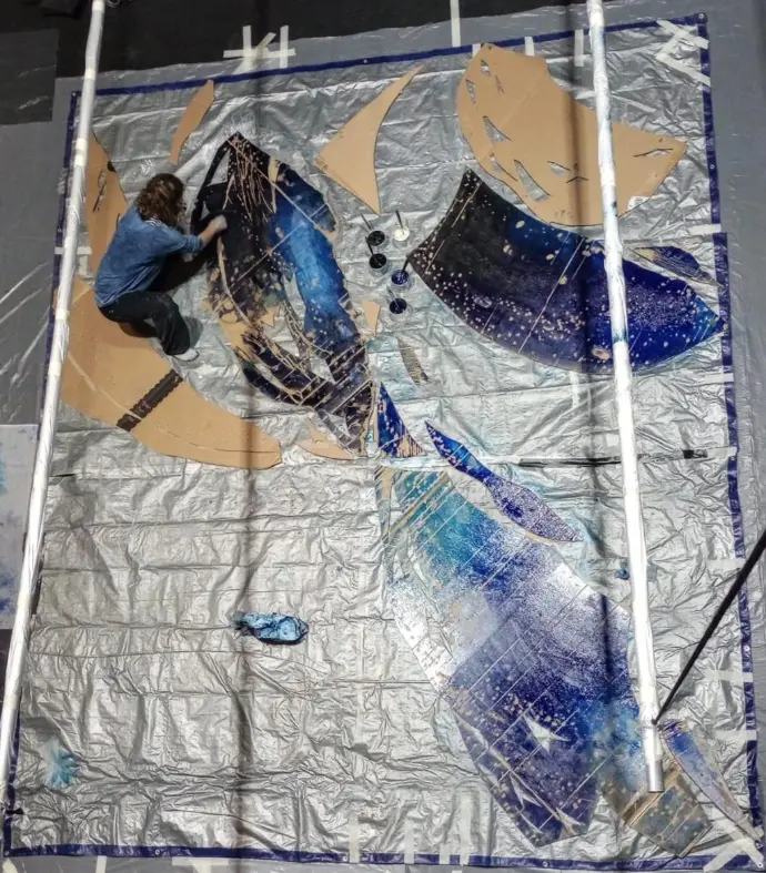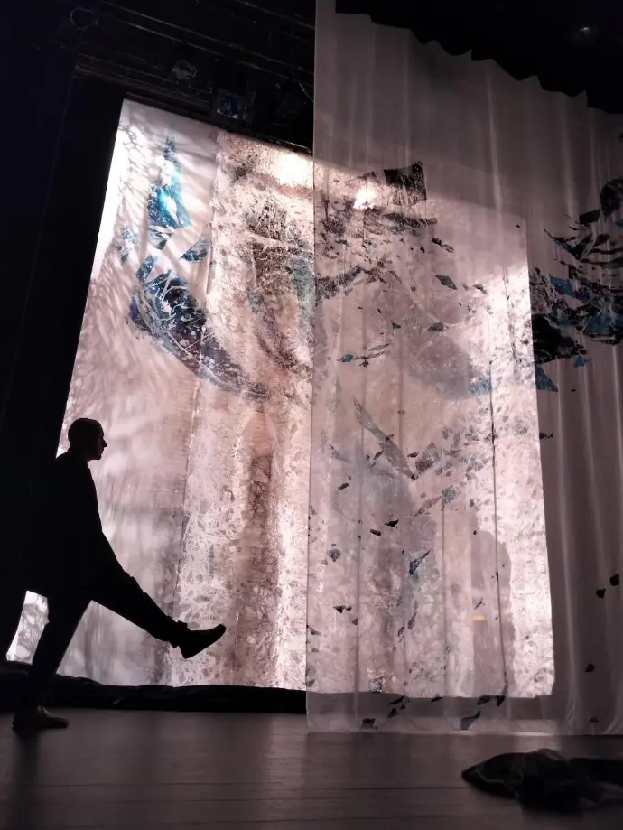 A cette toile de fond rétro-éclairée se superposent ensuite différents voiles. Ceux-ci sont encrées et imprimés manuellement à partir de matrices en carton réalisées sur scène.