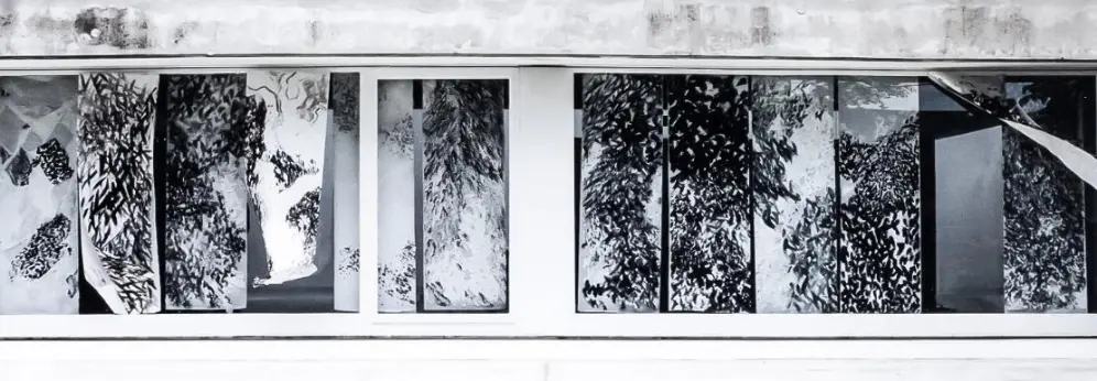 Installation / 12 pans de papier japon doubles de 170 x 70 cm, encre de chine et mine de plomb / 2006 / 170 x 900 cm