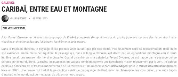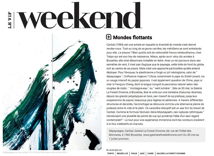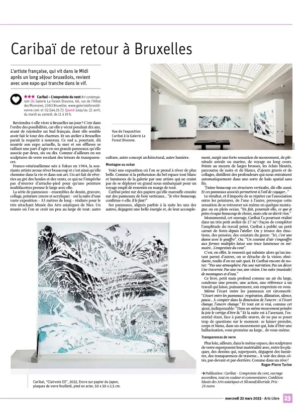 " [...] I slowly wander through the La Forest Divonne gallery, allowing myself to be overwhelmed by the beauty of the cool colours, the warmth of creation, the ingenuity of the artist. A work like no other. "